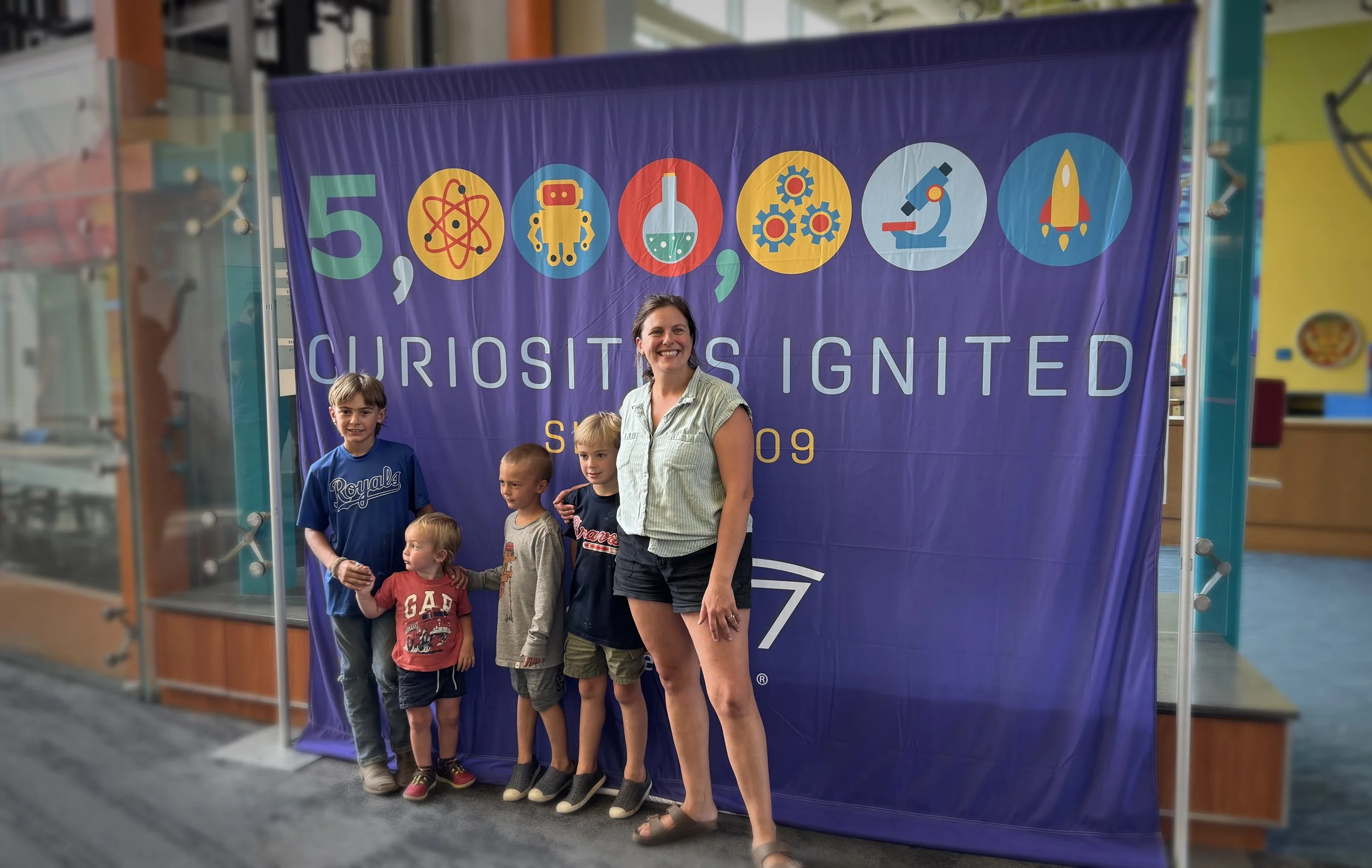 The milestone moment was marked with cheers and a special ceremony honoring our 5 millionth guest, Caroline South, along with her four sons—Cashen, Connor, Joseph, and Tanner—from Woodbury, CT. Visiting the Science Center on a sunny summer day, they came to explore Pixar, meet our critter friends, and, of course, brave a turn in the Hurricane Simulator. They were warmly welcomed by Science Center staff and presented with an exclusive prize package—including a complimentary membership to the Science Center. Other visitors in attendance received a commemorative 5 Million Curiosities Ignited t-shirt.